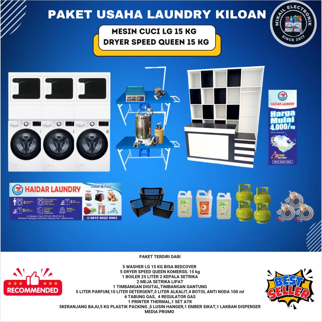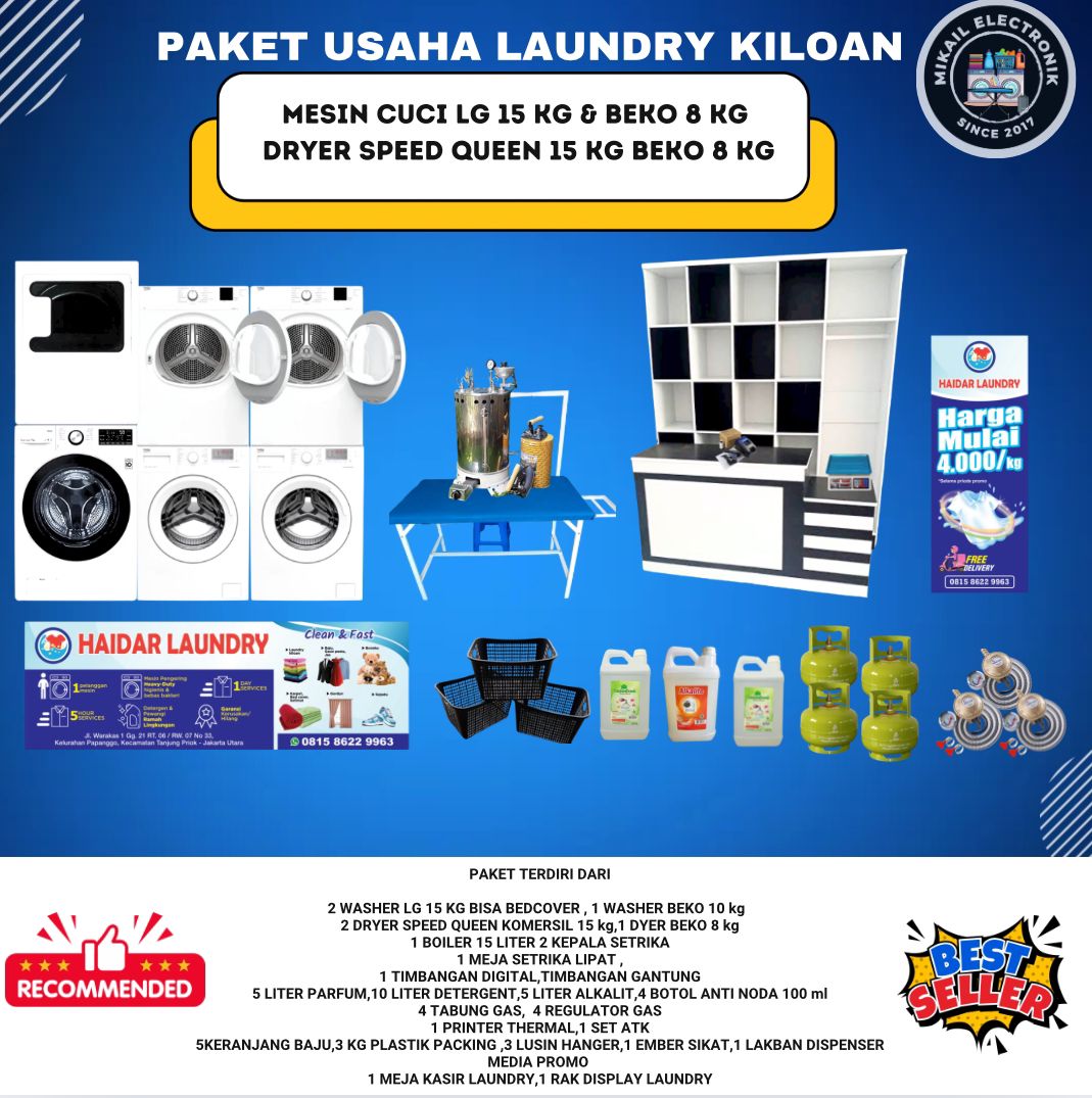 Peralatan yang disediakan adalah produk berkualitas tinggi dan tahan lama. Mesin-mesin ini dirancang untuk penggunaan komersial dengan kinerja optimal, memastikan hasil cucian maksimal dan efisien.